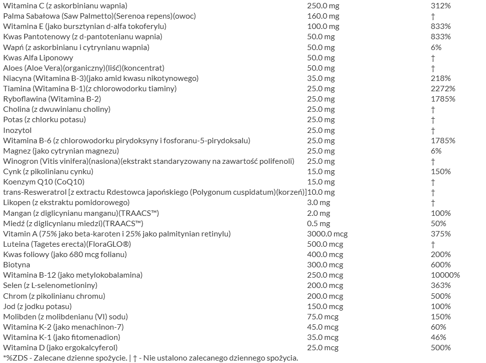 Vitamin A, Witamina C, Witamina D, Witamina E, Witamina K-1, Tiamina, Ryboflawina, Niacyna, Witamina B-6, Kwas foliowy, Witamina B-12, Biotyna, Kwas Pantotenowy, Cholina, Wapń, Jod, Magnez, Cynk, Selen, Miedź, Mangan, Chrom, Molibden, Potas, Palma Sabałowa, Kwas Alfa Liponowy, Aloes, Winogron, Inozytol, Koenzym Q10, trans-Resweratrol, Likopen, Luteina, Witamina K-2, wypełniacz: celuloza mikrokrystaliczna, otoczka kapsułki: hypromeloza, substancja wiążąca: kwasy tłuszczowe, substancje przeciwzbrylające: dwutlenek krzemu.