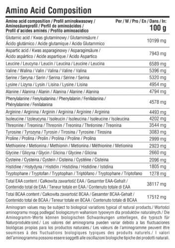 • Profil aminokwasowy: 38 g EAA i 17,5 g BCAA na 100 g, w tym leucyna 6,6 g