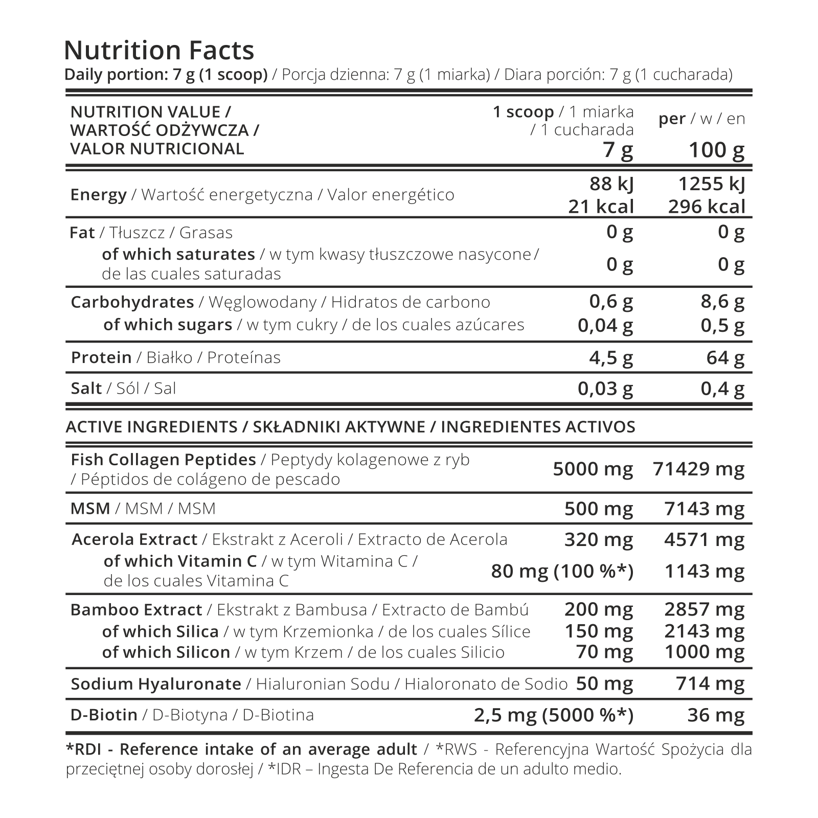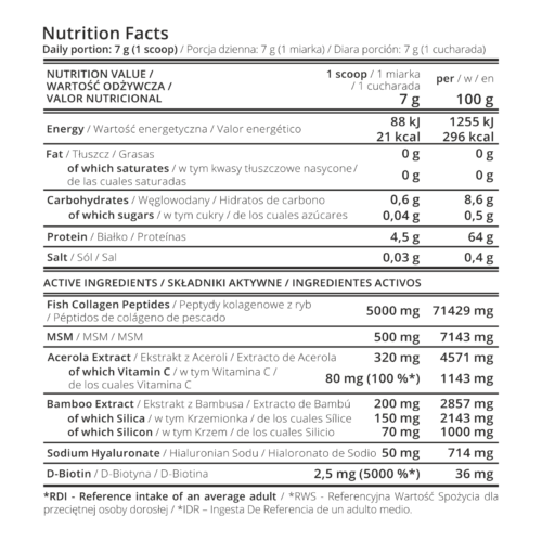 Hydrolizowany kolagen rybi; metylosulfonylometan (MSM); ekstrakt z aceroli [owoc] (Malpighia glabra) [25% witaminy C]; ekstrakt z bambusa [pędy] (Bambusa vulgaris) [75% krzemionki]; sok z buraka czerwonego w proszku; kwas hialuronowy (hialuronian sodu); D-biotyna; aromaty naturalne; regulator kwasowości: kwas cytrynowy. Produkt może zawierać: ryby.