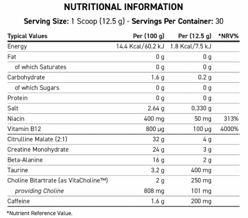 Wymieszaj jedną porcję (12,5 g) z 250 ml zimnej wody i spożyj 15–30 minut przed treningiem. Nowym użytkownikom zaleca się rozpoczęcie od połowy porcji przez pierwsze 7 dni.