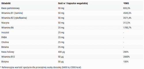 Składniki B-Complex: Witamina B1 (monoazotan tiaminy), cholina (dwuwinian choliny), kwas pantotenowy (D-pantotenian wapnia), substancja wypełniająca - celuloza mikrokrystaliczna, witamina B2 (ryboflawina), niacyna (amid kwasu nikotynowego), witamina B6 (chlorowodorek pirydoksyny), inozytol, PaBa (kwas p-aminobenzoesowy), betaina (trimetyloglicyna TMG), witamina B12 (metylokobalamina), substancja przeciwzbrylająca - sole magnezowe kwasów tłuszczowych, kwas foliowy (kwas pteroilomonoglutaminowy), biotyna (D-biotyna), kapsułka - substancja wypełniająca - hydroksypropylometyloceluloza. Może zawierać mleko, soję, jaja i orzechy.
