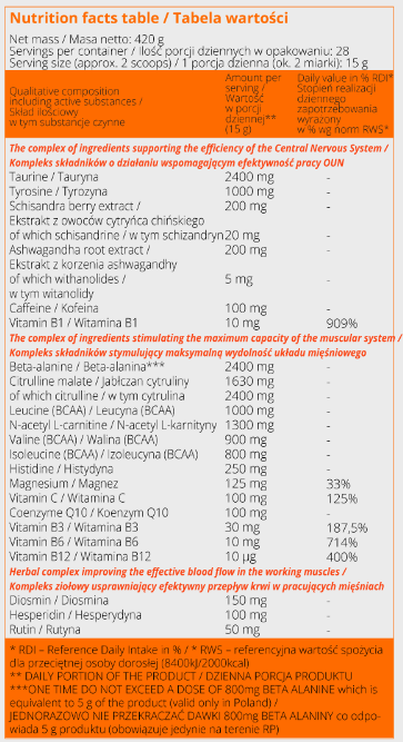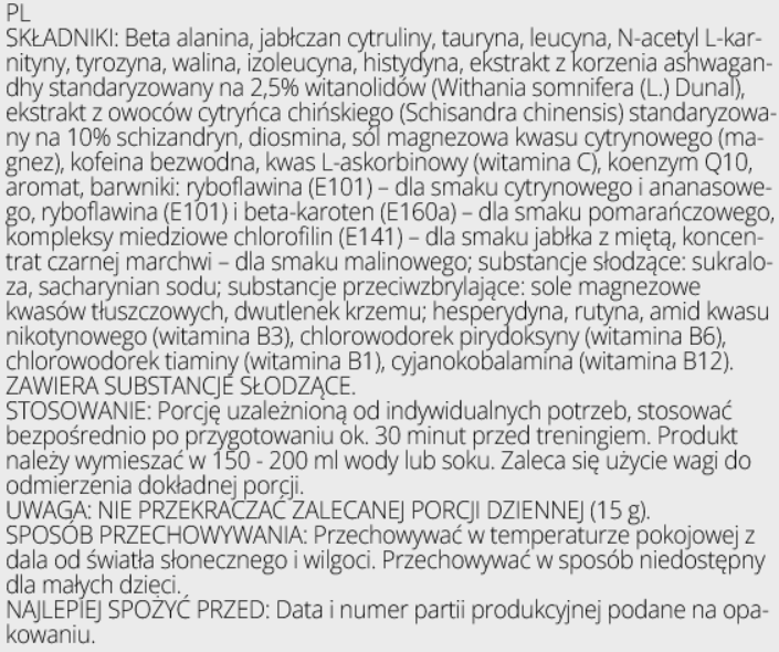 Zaleca się przyjmowanie jednej porcji (30 g) przed treningiem, rozpuszczając ją w wodzie. Dzięki łatwej formie, produkt idealnie wpisuje się w codzienny rytuał treningowy.