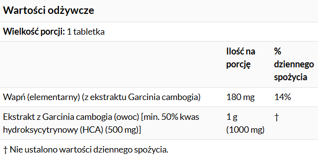 - Wapń (z ekstraktu Garcinia cambogia): 180 mg (14% RWS)