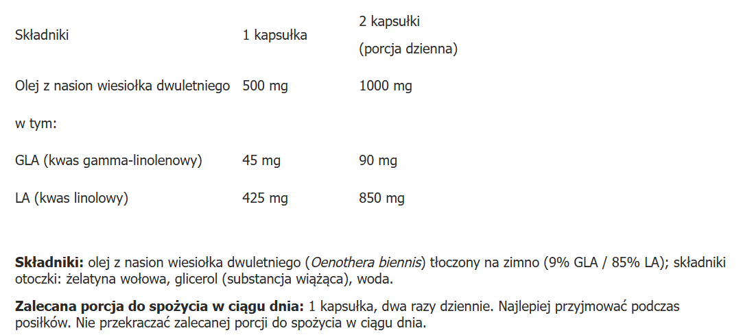 Każda kapsułka zawiera 500 mg oleju z nasion wiesiołka, w tym: