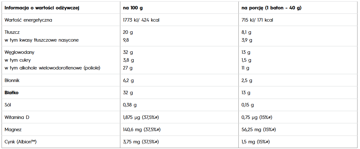 Zalecane jest spożywanie jednego batona dziennie, najlepiej po treningu, jako szybka regeneracja, lub jako przekąska między posiłkami. Olimp IM Pro Protein Bar doskonale sprawdza się również w czasie intensywnych dni, kiedy potrzebujesz dodatkowego źródła białka.