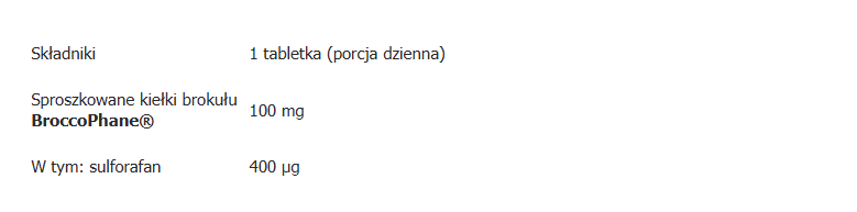 Składniki: sproszkowane kiełki brokułu (Brassica oleracea italica) BroccoPhane® standaryzowane na 0,4% sulforafanu, substancja wypełniająca (celuloza mikrokrystaliczna).